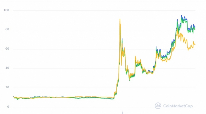 도지코인의 시가총액은 920억 달러(약 32조5000억원)로 집계됐다.